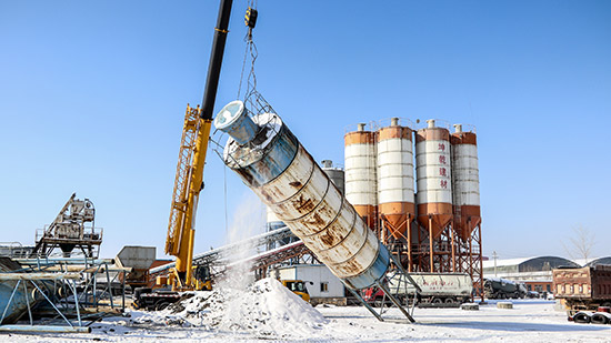 內蒙古玉泉區政府施工車輛對坤乾商砼站攪拌罐進行拆除吊裝。赫雨田攝