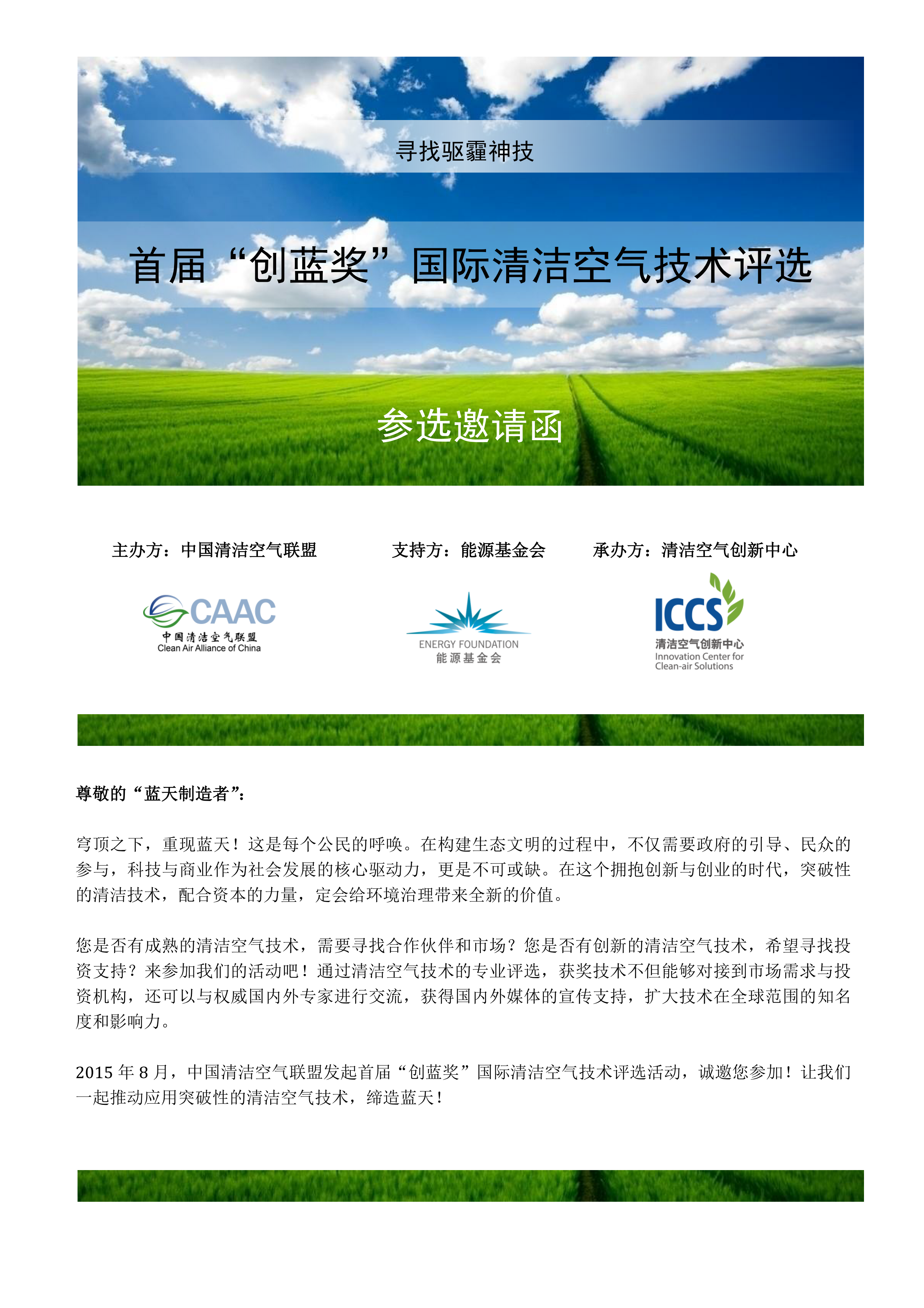 2015年8月,中國清潔空氣聯(lián)盟發(fā)起首屆“創(chuàng)藍獎”國際清潔空氣技術評選活動,誠邀您參加!讓我們一起推動應用突破性的清潔空氣技術,締造藍天!