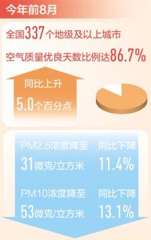 “今年藍(lán)天明顯更多,看,年初到現(xiàn)在跑步的里程,幾乎是去年同期的兩倍。”山西太原市民李進(jìn)的手機(jī)APP里,記錄著他的運(yùn)動(dòng)軌跡。今年上半年,太原市空氣質(zhì)量?jī)?yōu)良天數(shù)增加22天。 生態(tài)環(huán)境部公布的數(shù)據(jù)顯示,今年前8月,全國(guó)337個(gè)地級(jí)及以上城市空氣質(zhì)量平均優(yōu)良天數(shù)比例達(dá)86.7%,同比上升5.0個(gè)......